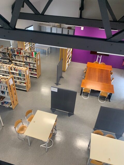 Le CDI s’étend sur une salle de 400 m² tout en longueur, surplombée d’une mezzanine de 100 m² (réservée aux étudiants).